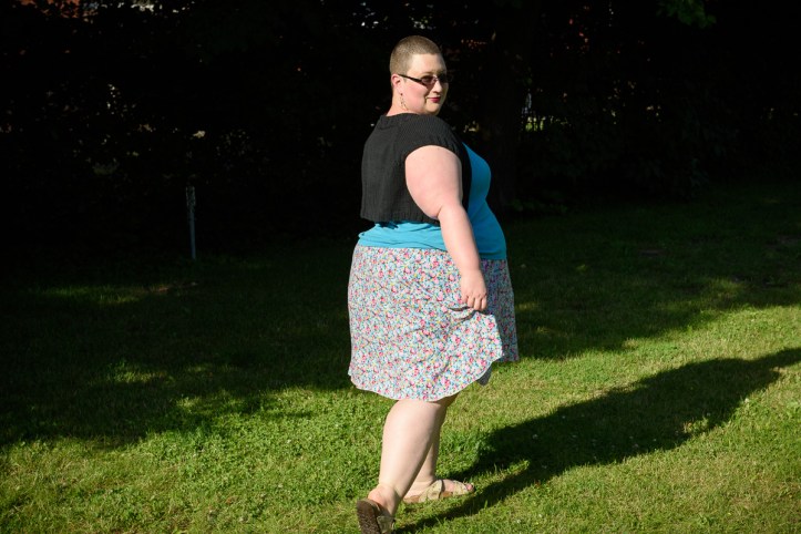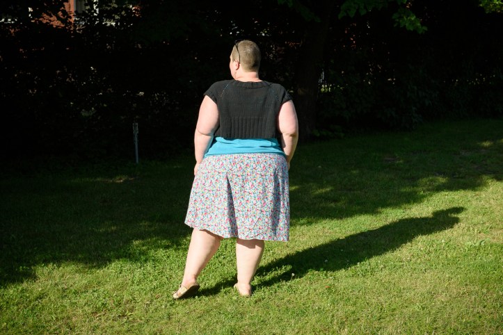 I love the shrug! I have one with sleeves and take it with me or put it on as soon as I wear a dress. This one looks really great and compliments your waist 🙂