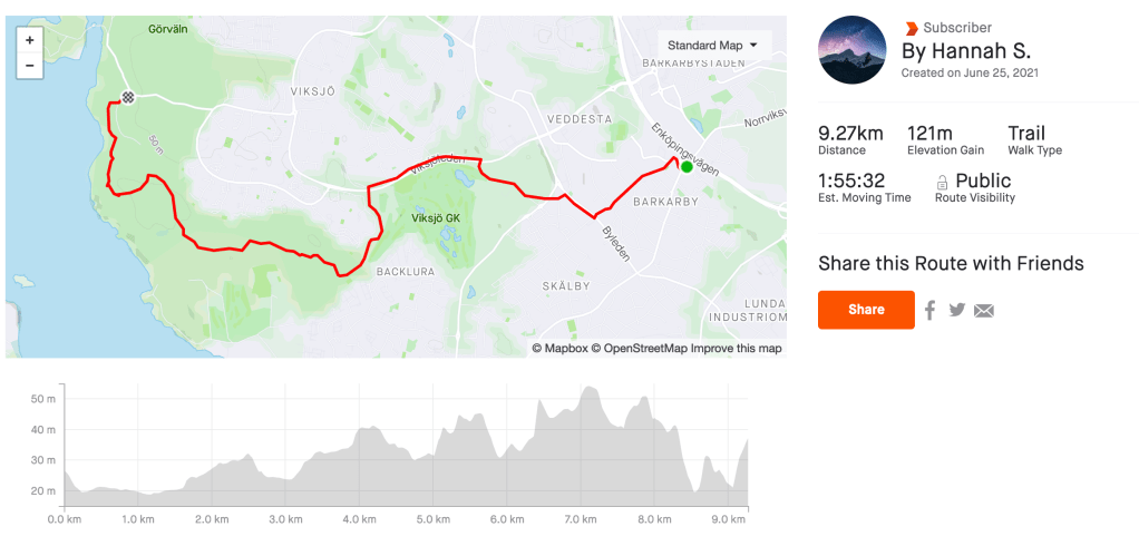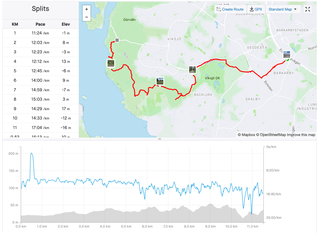 The planned distance was just over 9 km and I ended up at 11.5 km due to missing the trail a few times. It was just about 2.5 hours of walking, mostly due to stopping to figure out where the trail actually was – or to deal with mosquitos. You can also clearly see that my pace drops considerably when switching from smooth path to hiking.