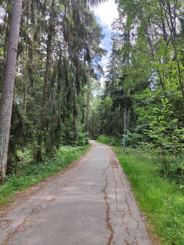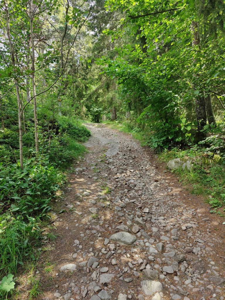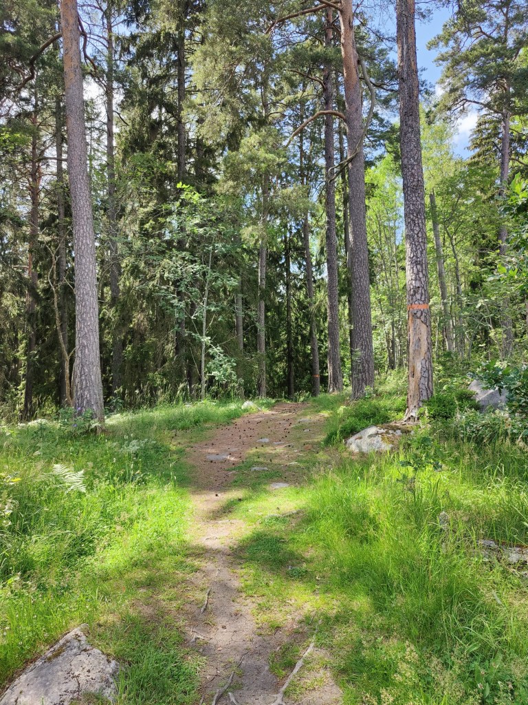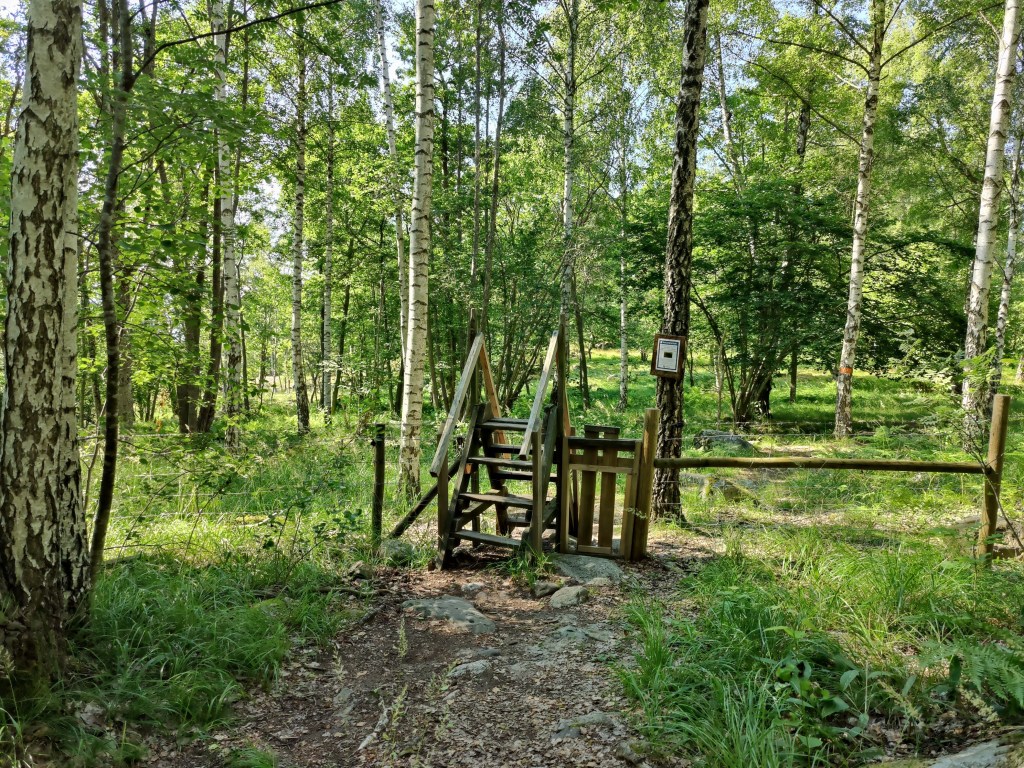 A large part of this section goes through Görvälns Naturreservat and it’s one of my favorite nature areas. The trees are so tall that with the least bit of wind, it sounds like there are waves on a beach. Part of the area are used for (mostly) sheep grazing, so you see lots of stiles – not many sheep this time, though.