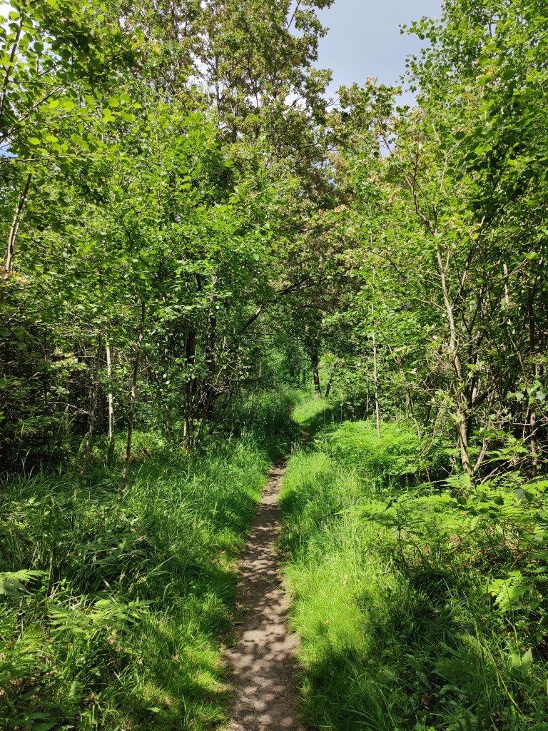 Right around the 5 km mark, we head under the road and enter a forest. From here on out, it’s mostly green. So much green. I stopped within 500m to put on mosquito spray. The path is also well marked except where plants have grown so fast as to obscure the markings.