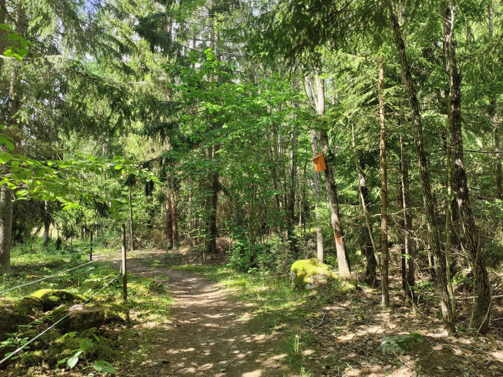 The path veers off the road into proper trails again – and hey, it’s an orange birdhouse to mark the way! I spotted these all throughout the Upplands Väsby section of Upplandsleden.