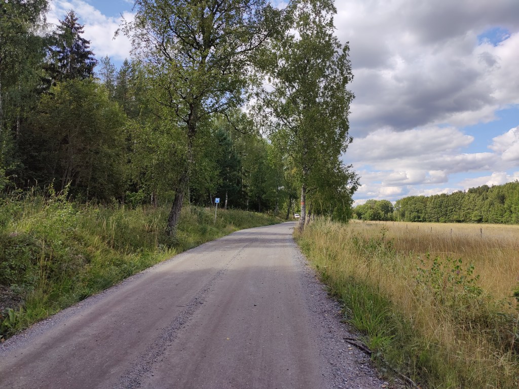 The first kilometers involve following this gravel road, complete with “M” signs. I’ve seen them all over Sweden on these smaller roads but haven’t actually figured out the sign’s meaning. I think it indicates a small widening of the road so that you have space to pass.