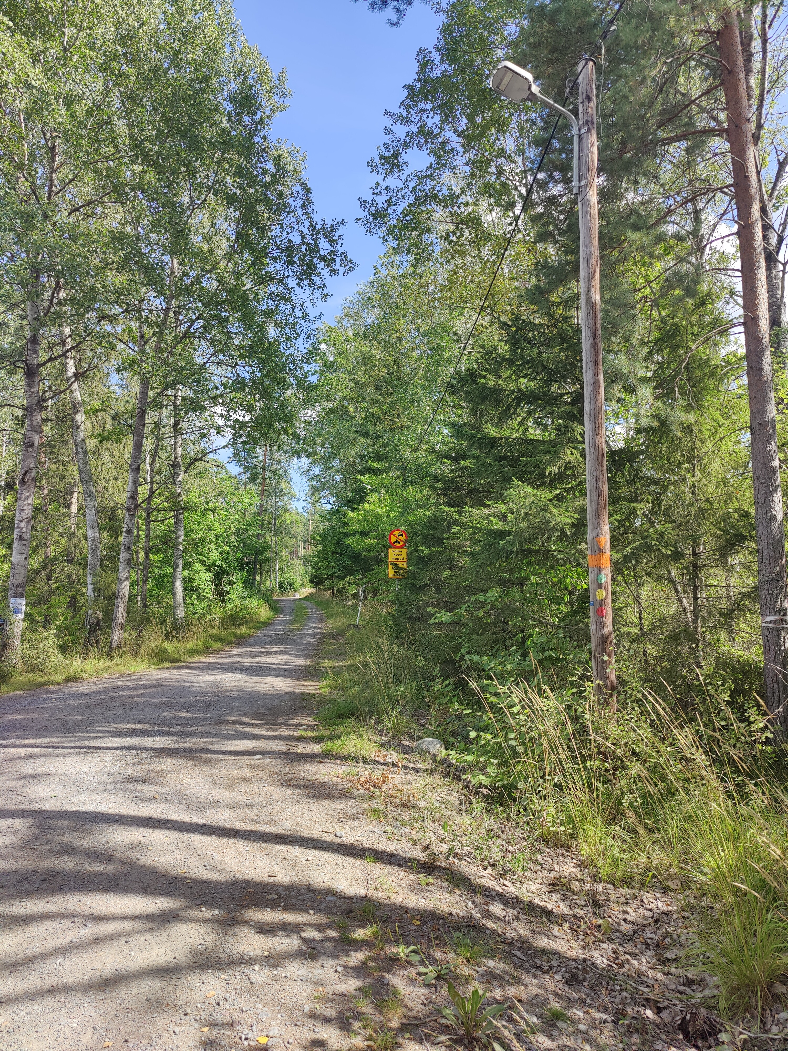 Starting at the parking lot just off the main road at Harva, there’s the first Upplandsleden orange marker of the day over on the power post: